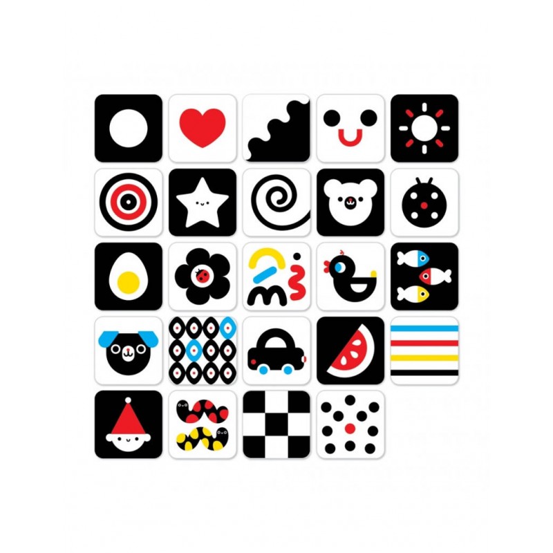 Όταν το βιβλίο τοποθετείται μπροστά στο μωρό, το εμπνέει πραγματικά να σηκώσει το κεφάλι του - να κοιτάξει ψηλά! Κατά τη γέννηση, η όραση είναι ακόμη υπανάπτυκτη. Στην αρχή τα μωρά βλέπουν καλύτερα τα καθαρά μοτίβα που έχουν μεγάλες αντιθέσεις, ενώ η ικανότητα τους να διακρίνουν τις λεπτομέρειες και τα χρώματα της εικόνας αναπτύσσεται σταδιακά τους επόμενους μήνες. Γι' αυτό στα μωρά αρέσουν τόσο πολύ οι αντιθέσεις. Οι γονείς μπορούν να κρεμάσουν ένα φυλλάδιο ή μια-μια τις κάρτες δίπλα στο κρεβάτι ή το καρότσι ή να δημιουργήσουν μια γιρλάντα από αυτές.