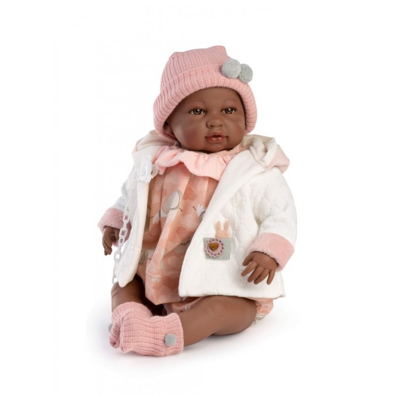 Κούκλα μωρό με ήχο και αρθρώσεις 50cm με σώμα μαλακό, χέρια και πόδια με αρθρώσεις και κατασκευασμένα από βινύλιο. Όταν το πιέζεις στο στήθος, κλαίει και φωνάζει μαμά-μπαμπά. Είναι ισπανικό κι αναδύει απαλό άρωμα βανίλιας.