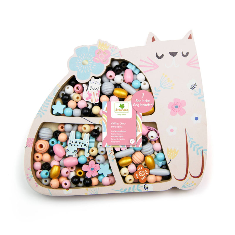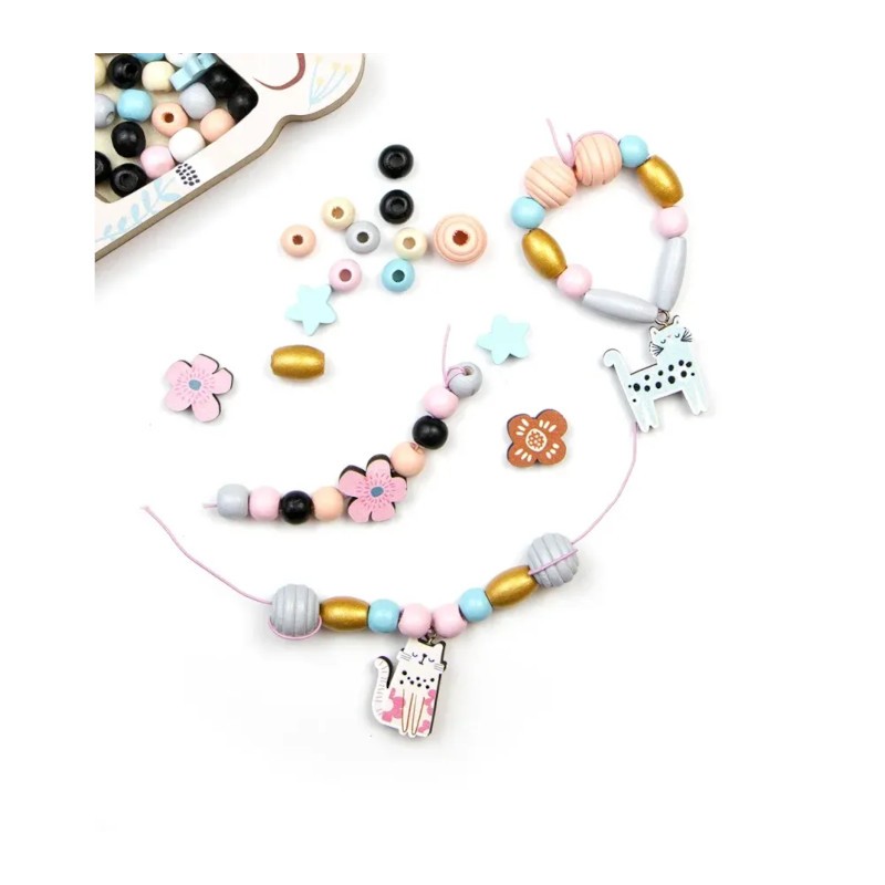 Ένα σετ με πολλές ξύλινες χάντρες για να φτιάξετε φανταστικά κοσμήματα. Το ξύλινο κουτί σε σχήμα γάτας περιέχει περισσότερες από 210 χάντρες και 3 μέτρα κλωστή.