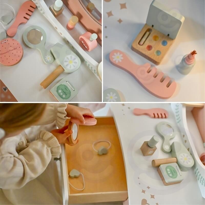 Αυτό το ξύλινο μπουντουάρ υψηλής ποιότητας διαθέτει έναν απαλά φωτισμένο καθρέφτη, προσθέτοντας μια απαλή, ρεαλιστική πινελιά στις παιδικές δραστηριότητες ρόλων, δημιουργώντας ένα φιλόξενο και χαλαρωτικό περιβάλλον παιχνιδιού. Η ζεστή παστέλ ροζ παλέτα και οι λεπτομέρειες αντανακλούν μια μπουτίκ αισθητική που ταιριάζει άψογα στους σύγχρονους εσωτερικούς χώρους. Κατασκευασμένο από ανθεκτικό λείο ξύλο,ασφαλή φινιρίσματα για παιδιά , αυτό το σετ ενθαρρύνει την ανεξαρτησία, την ανάπτυξη της λεπτής κινητικότητας και την ευφάνταστη έκφραση μέσα από ένα παιχνίδι ανοιχτού τύπου. Τα ξύλινα αξεσουάρ που περιλαμβάνονται έχουν μέγεθος για μικρά χεράκια και προάγουν πρακτικές δεξιότητες. Το σετ διαθέτει ένα σκαμπό ξύλινο και ένα συρτάρι αποθήκευσης για να βάζουν τα παιδιά τα αξεσουάρ τους.
