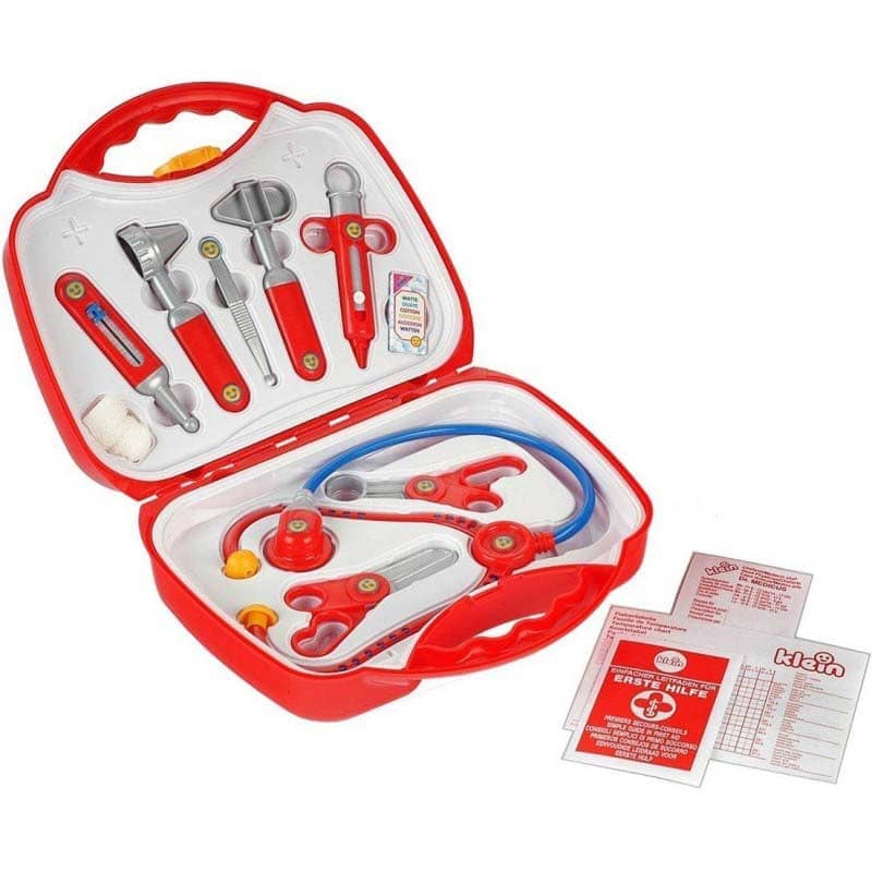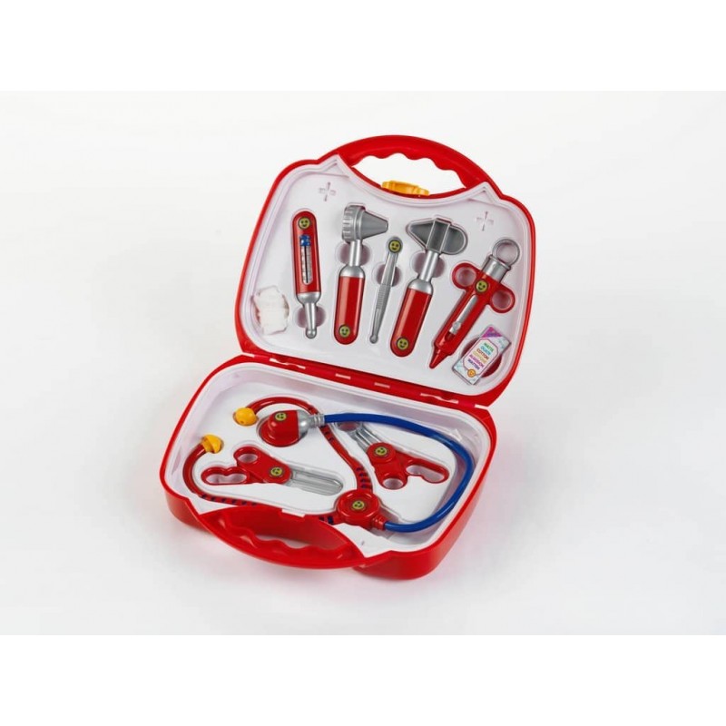 Βαλιτσάκι γιατρού μεσαίο μέγεθος με στηθοσκόπιο, σύριγγα, θερμόμετρο, γάζα, ωτοσκόπιο και αντανακλαστικό σφυρί, λαβίδα και ψαλίδια, και κάρτες για τους ασθενείς για να γράφετε το ιστορικό τους.