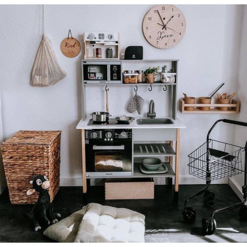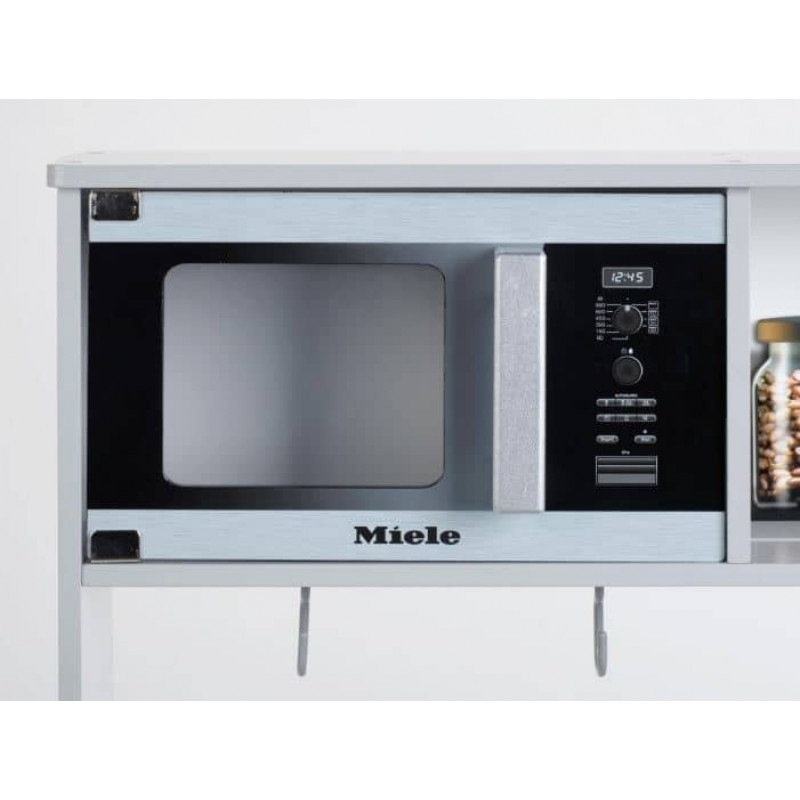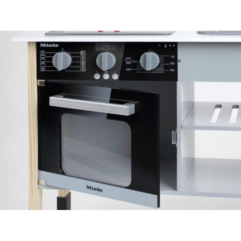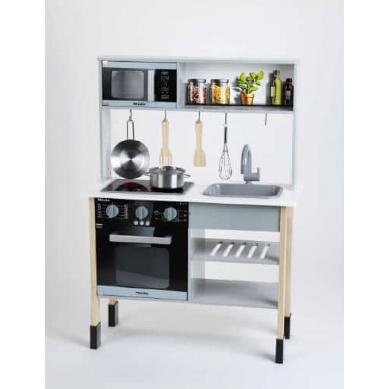 Υπέροχη παιδική ξύλινη κουζίνα Miele που περιλαμβάνει εστία με φωτισμό και ήχο, φούρνο μικροκυμάτων, φούρνο και αφαιρούμενο νεροχύτη. Επίσης περιέχει αξεσουάρ όπως κατσαρόλα, ξύλινη κουτάλα και τηγάνι.