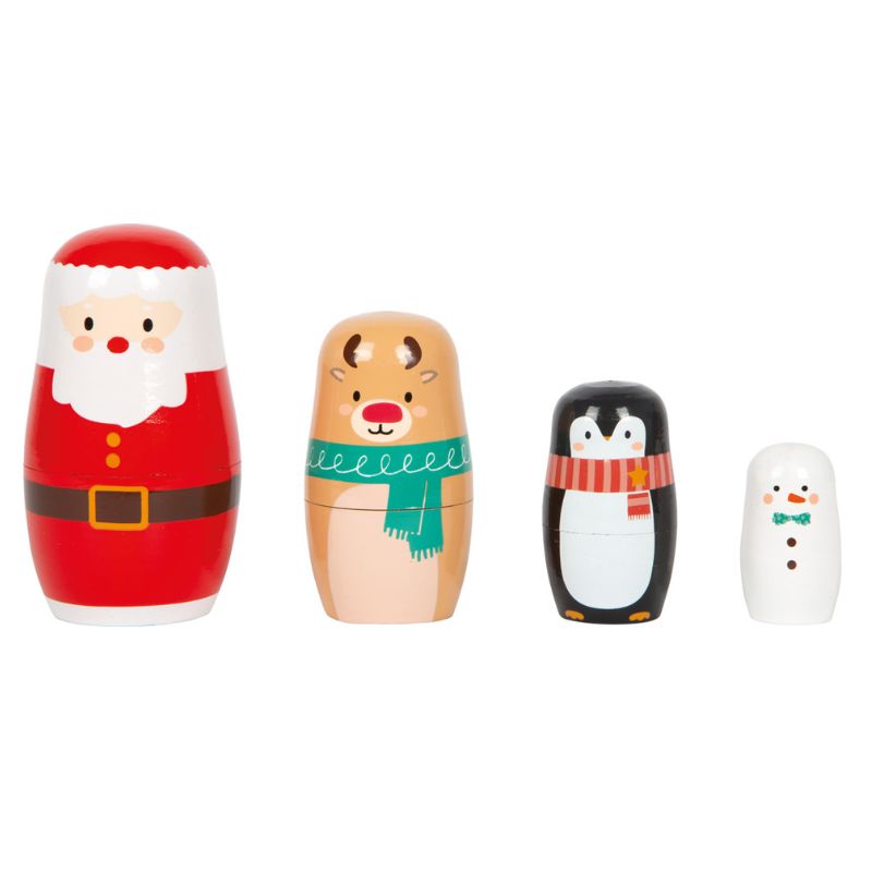 Αυτές οι χριστουγεννιάτικες κούκλες Matryoshka είναι κατασκευασμένες από ξύλο και κάνουν εξαιρετική εντύπωση με τα φιλικά προς τα παιδιά σχέδιά τους. Κάθε μία από τις τέσσερις φιγούρες, από τον Άγιο Βασίλη μέχρι τον χιονάνθρωπο, είναι ζωγραφισμένη με στοργικές λεπτομέρειες και λάμπει με το πνεύμα των Χριστουγέννων. Χάρη στα διαφορετικά μεγέθη, οι φιγούρες μπορούν να τοποθετηθούν η μία μέσα στην άλλη ή να παραταχθούν ξεχωριστά. Αυτές οι ενέργειες προάγουν την ανάπτυξη των λεπτών κινητικών δεξιοτήτων και του συντονισμού χεριού-ματιού με έναν διασκεδαστικό τρόπο. Είτε χρησιμοποιούνται ως παιχνίδια είτε ως χριστουγεννιάτικη διακόσμηση, αυτές οι κούκλες ματριόσκα είναι ευέλικτες και αγαπημένες από ανθρώπους όλων των ηλικιών.