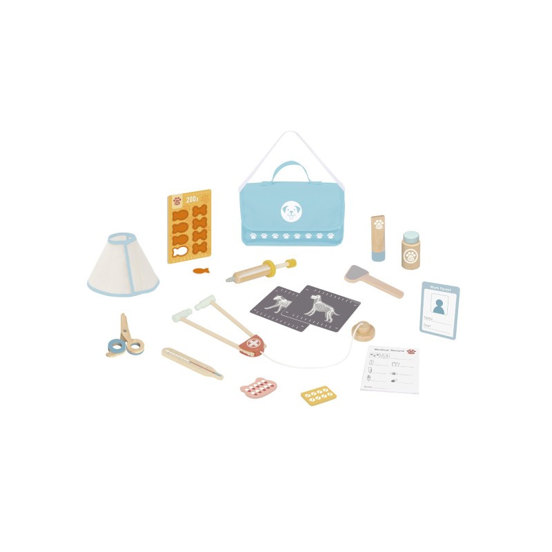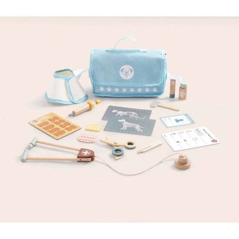 Ένα χαριτωμένο σετ κτηνίατρου για μικρά παιδιά που αγαπούν και λατρεύουν τα ζώα. Το σετ περιλαμβάνει εργαλεία ενός πραγματικού κτηνίατρου, όπως θερμόμετρο, στηθοσκόπιο, κολάρο, σύριγγα, ψαλίδι κ.α. ενθαρρύνοντας τη δημιουργικότητα και την ενσυναίσθηση καθώς τα παιδιά φροντίζουν τους τετράποδους φίλους τους. Όλα τα εργαλεία αποθηκεύονται σε μια υφασμάτινη τσάντα για εύκολη μεταφορά. Το παιχνίδι αυτό ενισχύει τις γνωστικές, κοινωνικές και συναισθηματικές δεξιότητες στα παιδιά, ενώ παράλληλα καλλιεργεί μια βαθιά αγάπη για τα ζώα.