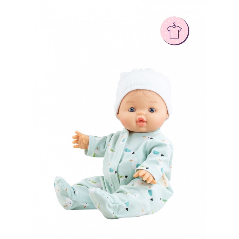 Σετ ρούχα από την εταιρεία Paola Reina για κούκλες μωρά 34εκ. Το σετ περιλαμβάνει γαλάζιο ολόσωμο φορμάκι και λευκό σκουφάκι. Η κούκλα ΔΕΝ περιλαμβάνεται.