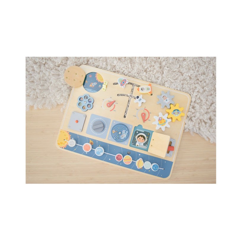 Εκτοξευτείτε σε ένα σύμπαν διασκέδασης με αυτόν τον εκπαιδευτικό πίνακα σχεδιασμένο για μικρούς εξερευνητές. Αυτό το ταμπλό διαθέτει μια σειρά από δραστηριότητες, όπως κουμπιά για ώθηση, μοχλούς για τράβηγμα, γρανάζια για περιστροφή, όλα με φόντο το διάστημα. Με την ποικιλία των δραστηριοτήτων αυτός ο πίνακας προσφέρει ατελείωτη διασκέδαση ενώ, παράλληλα, βοηθάει στην ανάπτυξη δεξιοτήτων. Βαμμένο σε απαλούς τόνους με μη τοξικά χρώματα εξασφαλίζει ασφάλεια για τις περιπέτειες των μικρών αστροναυτών.